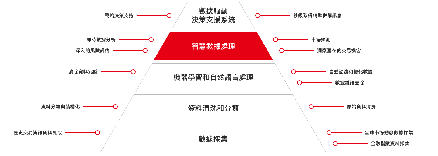 平臺結合了高效的機器學習演算法和自然語言處理技術,自動篩選並優化數據,去除噪音並消除冗餘,確保數據的準確性和時效性。 其智慧數據處理模組能夠即時分析數據趨勢,提供深度風險評估、市場預測和潛在交易機會洞察。